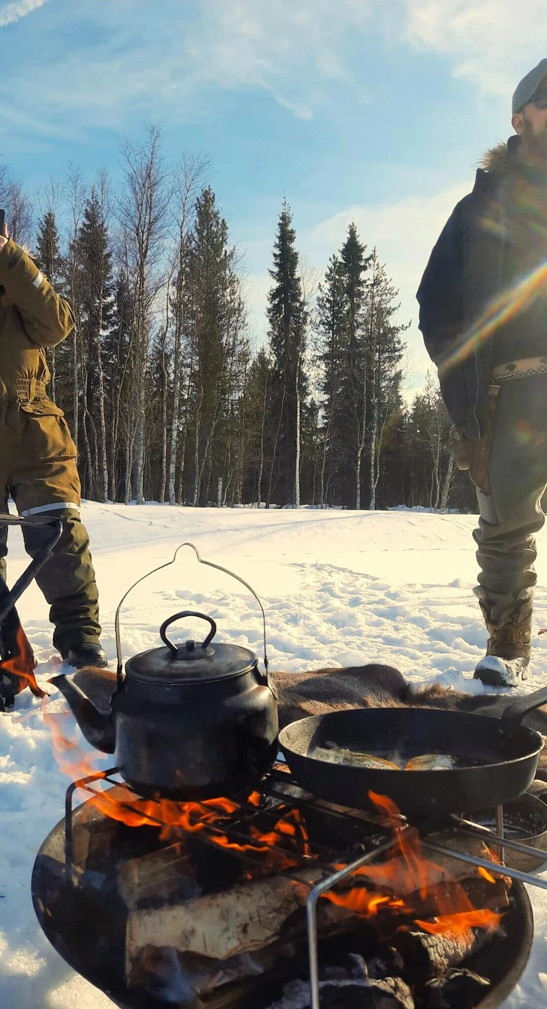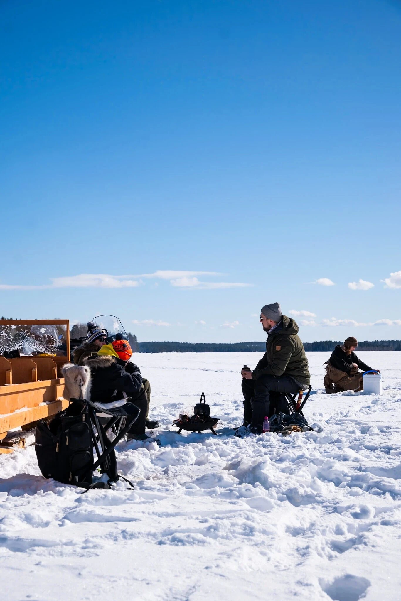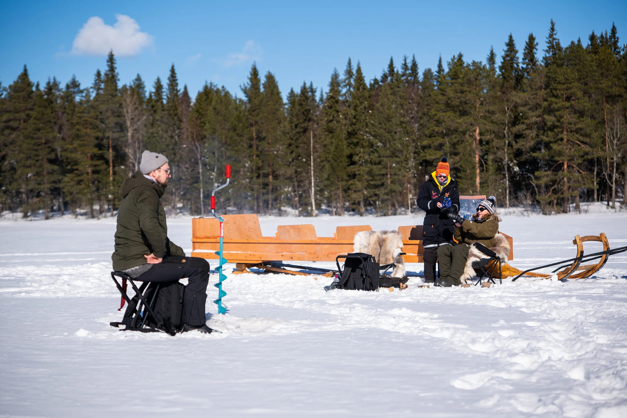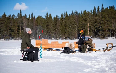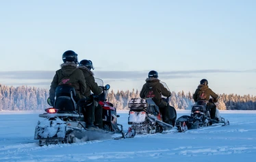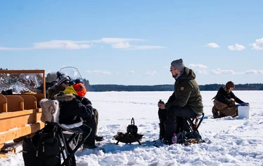 Start with a guided snowmobile safari and ride to the ice fishing location on a frozen lake. At the lake you will try traditional Finnish ice fishing. The guide shows the full process from drilling the hole to fishing safely on the ice, and a hot drink is included. Dinner is served by the campfire at the fishing area (salmon soup or meat soup), with bread, a beverage and a sweet dessert. After the meal, ride back by snowmobile with the guide.