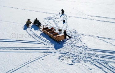 Children under 15 years old ride in a sled pulled by the guide.